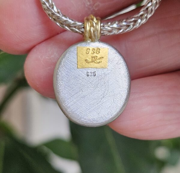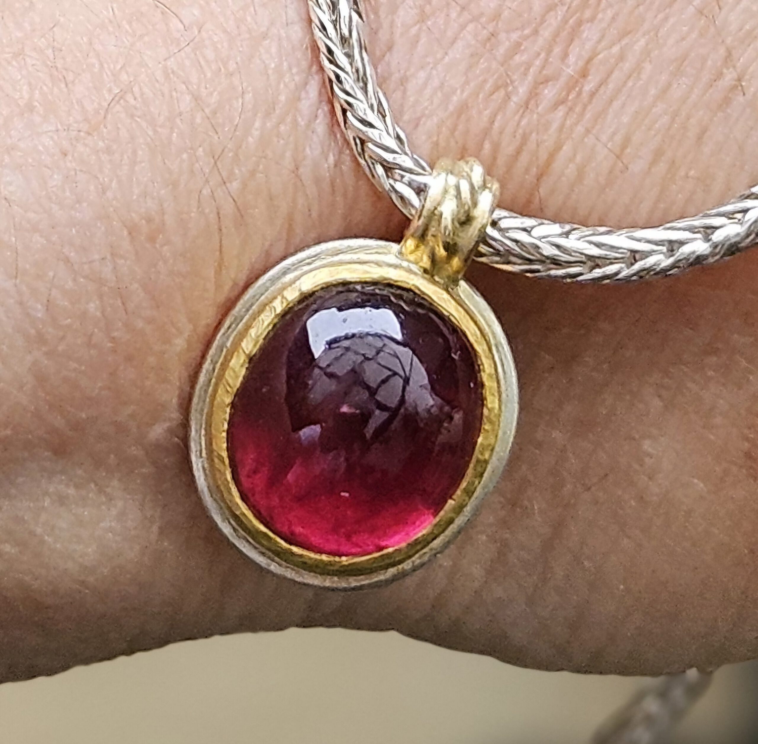 Dieser wurde mit einem schönen roten Turmalin-Cabochon ausgefasst. Die Fassung besteht aus Feingold (1000/000 Gold) und hat einen zarten Hammerschlag auf der Fasskante erhalten. Für die Steinauflage wurde 925 Silber und für die Aufhängerschlaufe wurde 750/000 Gelbgold verwendet. Die Oberfläche wurde abschlißend leicht mattiert und zart anpoliert. Die Länge des Anhängers beträgt 24, die Breite 26,5 mm und die Dicke 9 mm.