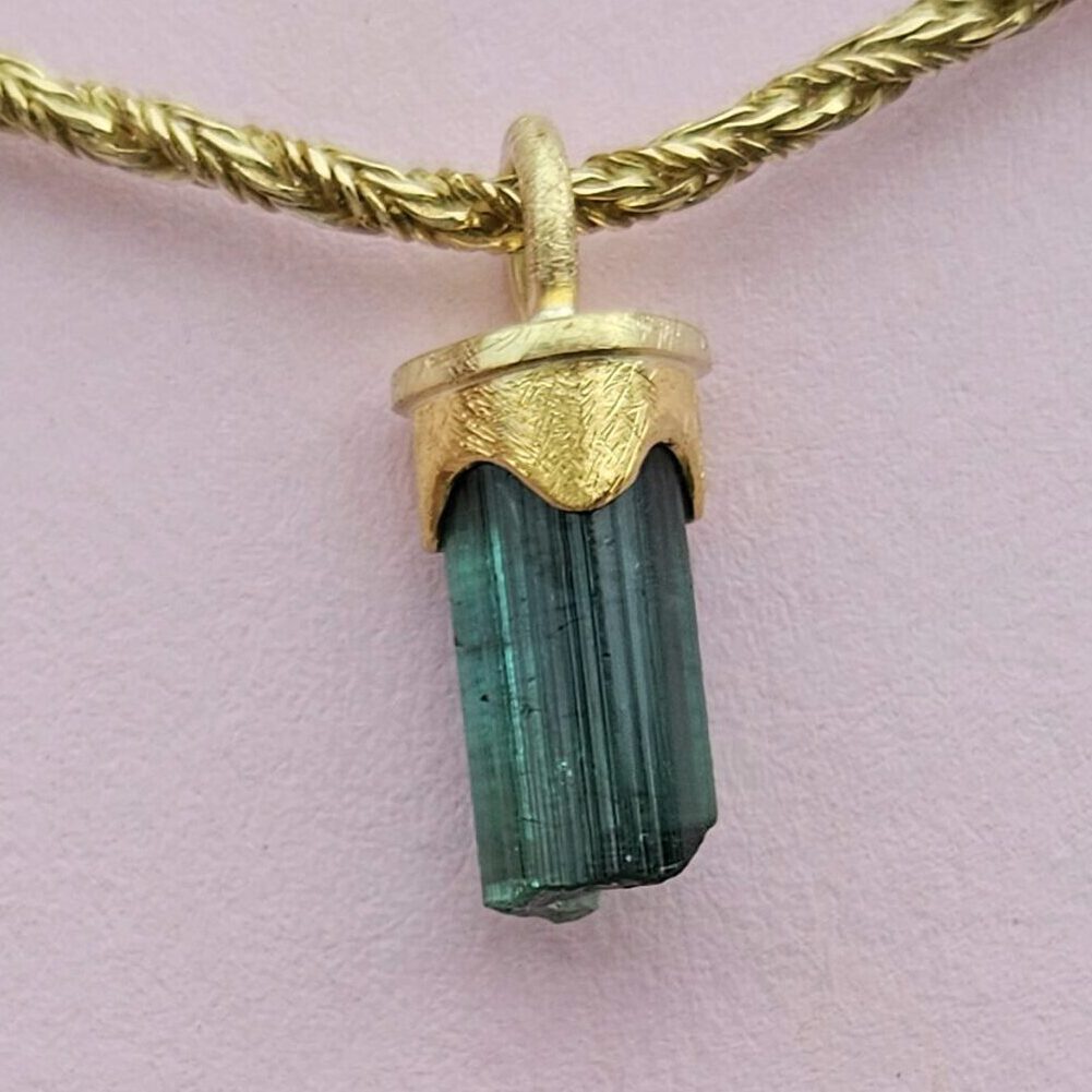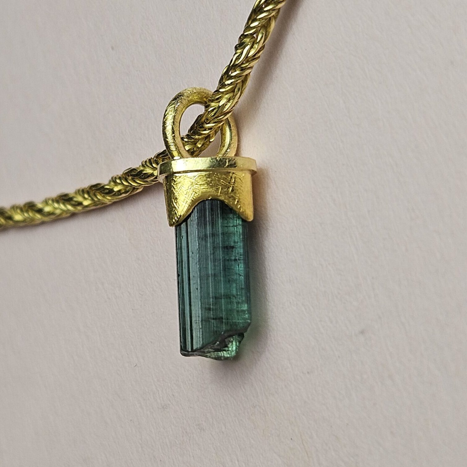 Bei diesem Schmuckstück handelt es sich um einen in Handarbeit gefertigten Anhänger. Dieser wurde mit einem grünen Turmalinkristall ausgefasst. Die Fassung besteht aus Feingold (1000/000 Gold), die Steinauflage und die Anhängerschlaufe aus 750/000 Gelbgold, die Oberfläche wurde strukturiert. Die Länge des Anhängers beträgt 20 mm, die Breite 8 und die Dicke 7 mm. Der Turmalin wiegt 4,56 ct.